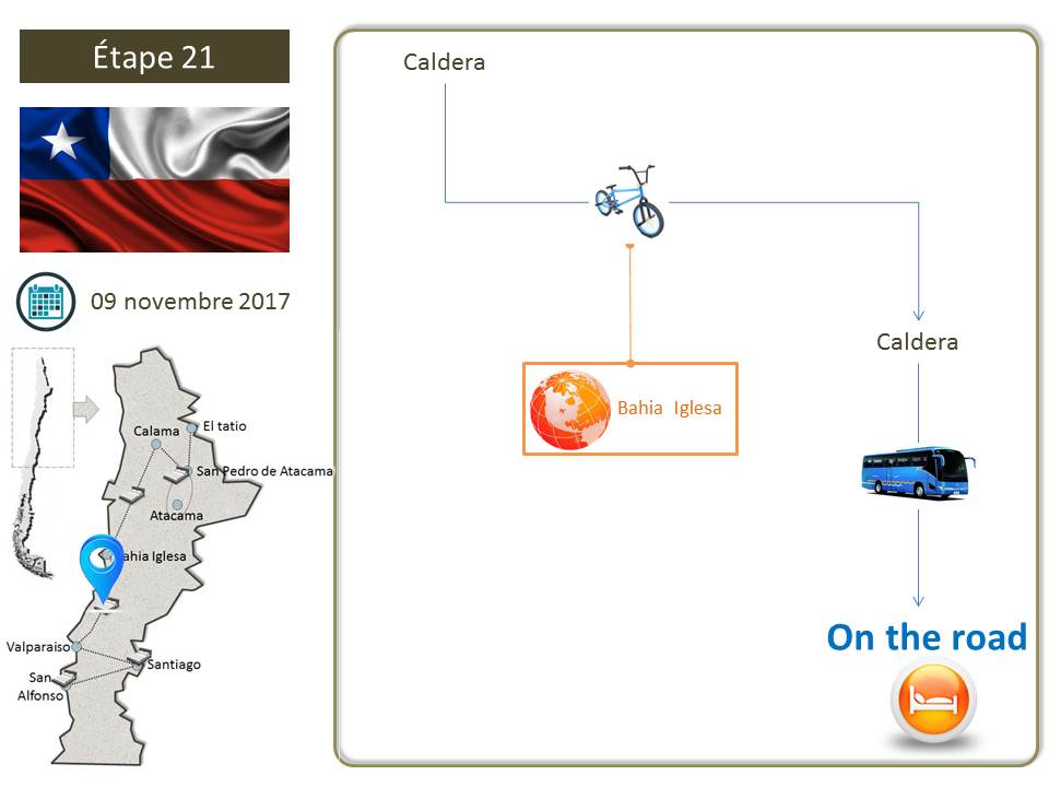 Bahia de Iglesa, terminus tout le monde descend! Après une nuit dans le bus, l'activité du jour consistera à profiter de l'une des plus belle plage volcanique du Chili... Une eau turquoise, du sable blanc et des roches noires qui contrastent, c'est dans cet environnement dédié à la détente que nous profiterons de l'occasion qui nous est donné pour aller se baigner dans le pacifique! Mais comme toute bonne chose à une fin, en soirée, nous retrouverons l'inconfort du bus pour réitérer l'expérience d'une nuit sur les routes chiliennes... direction Valparaiso!